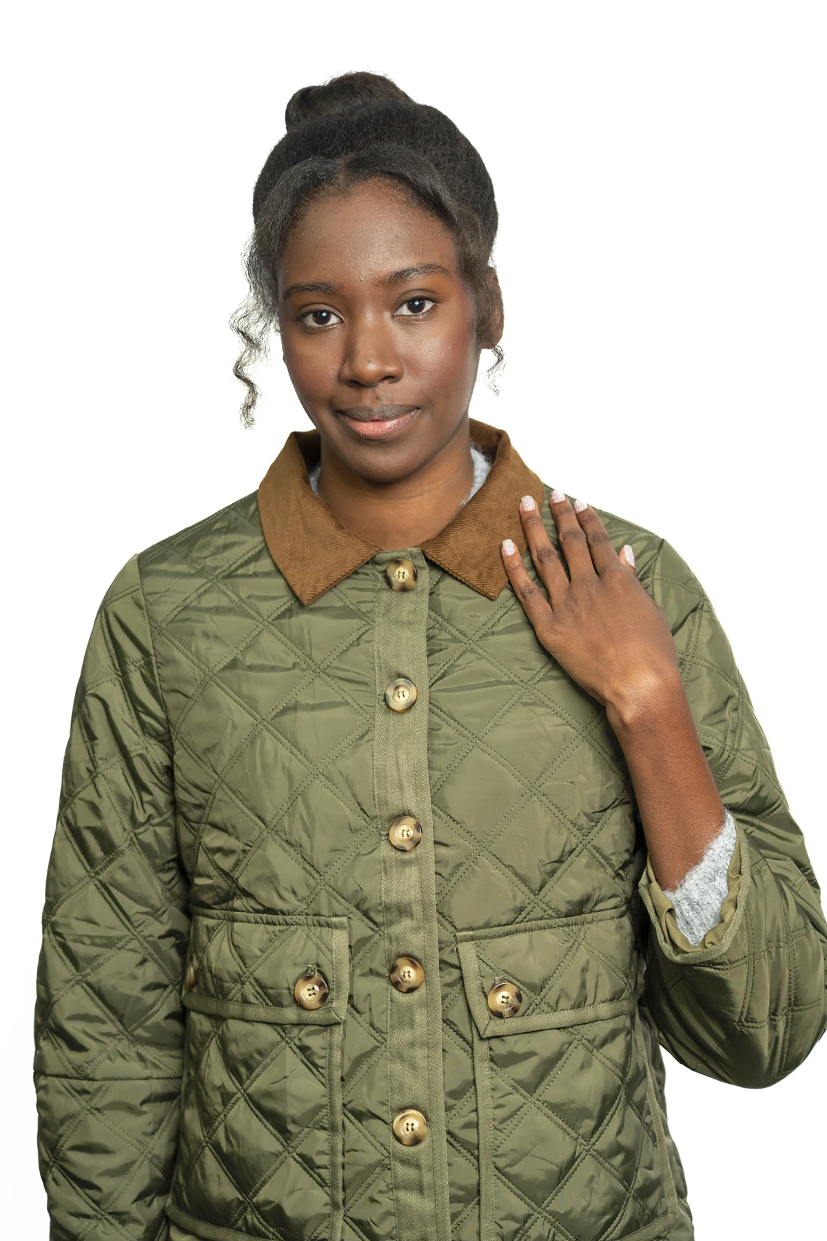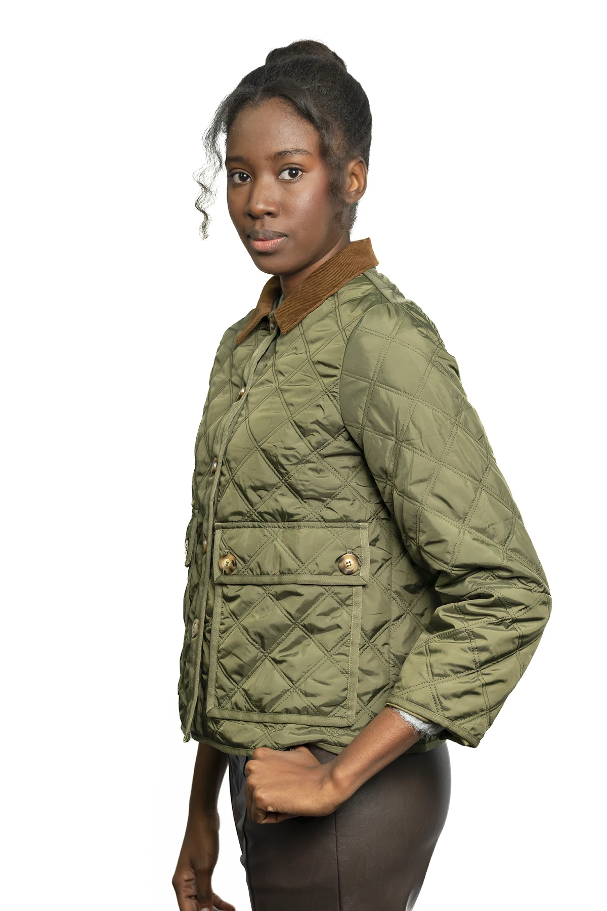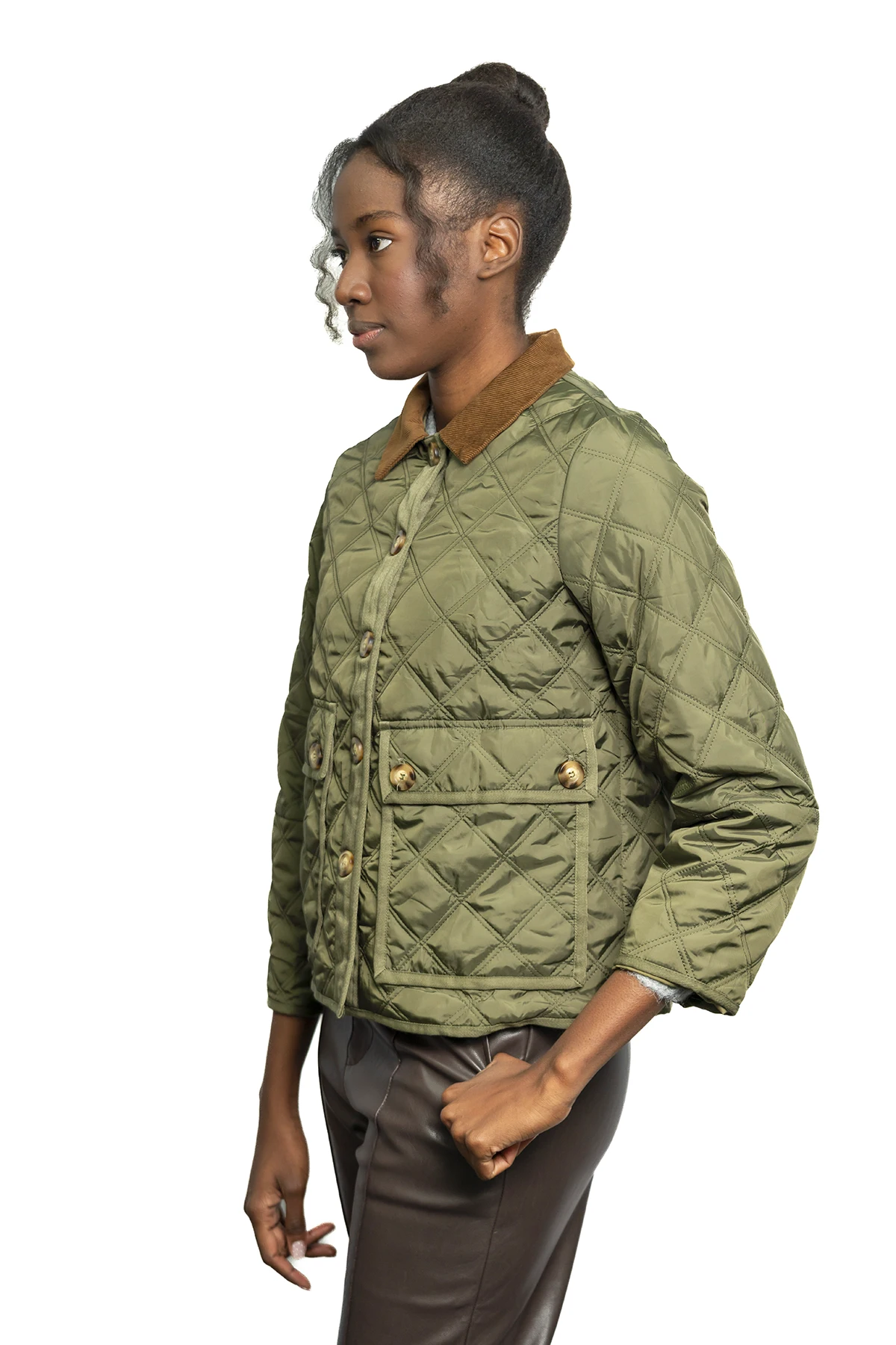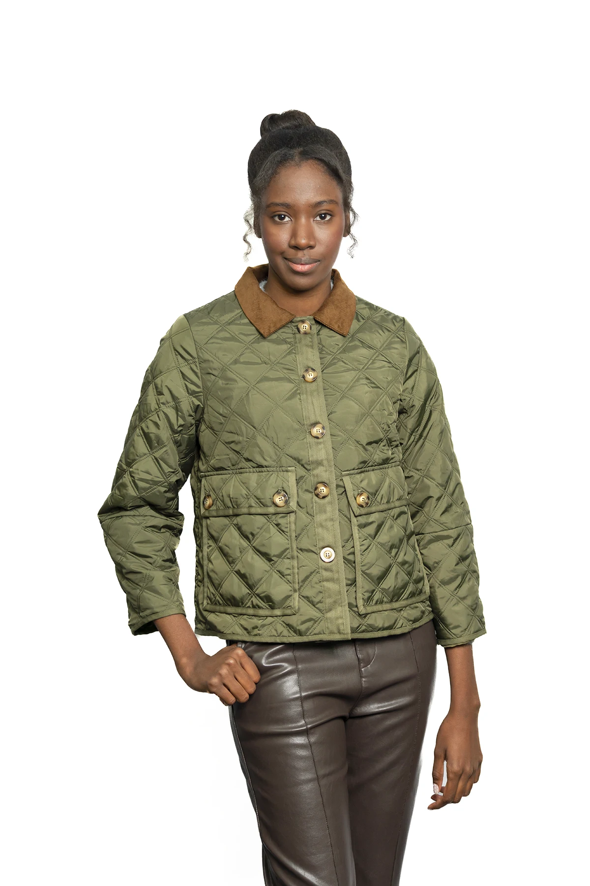 Una chaqueta acolchada de diseño ligero con patrón de rombos, cuello de pana en contraste y bolsillos frontales tipo cargo, ideal para un estilo «country chic» versátil y atemporal.