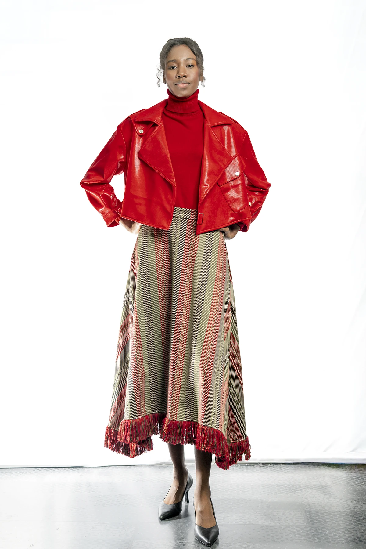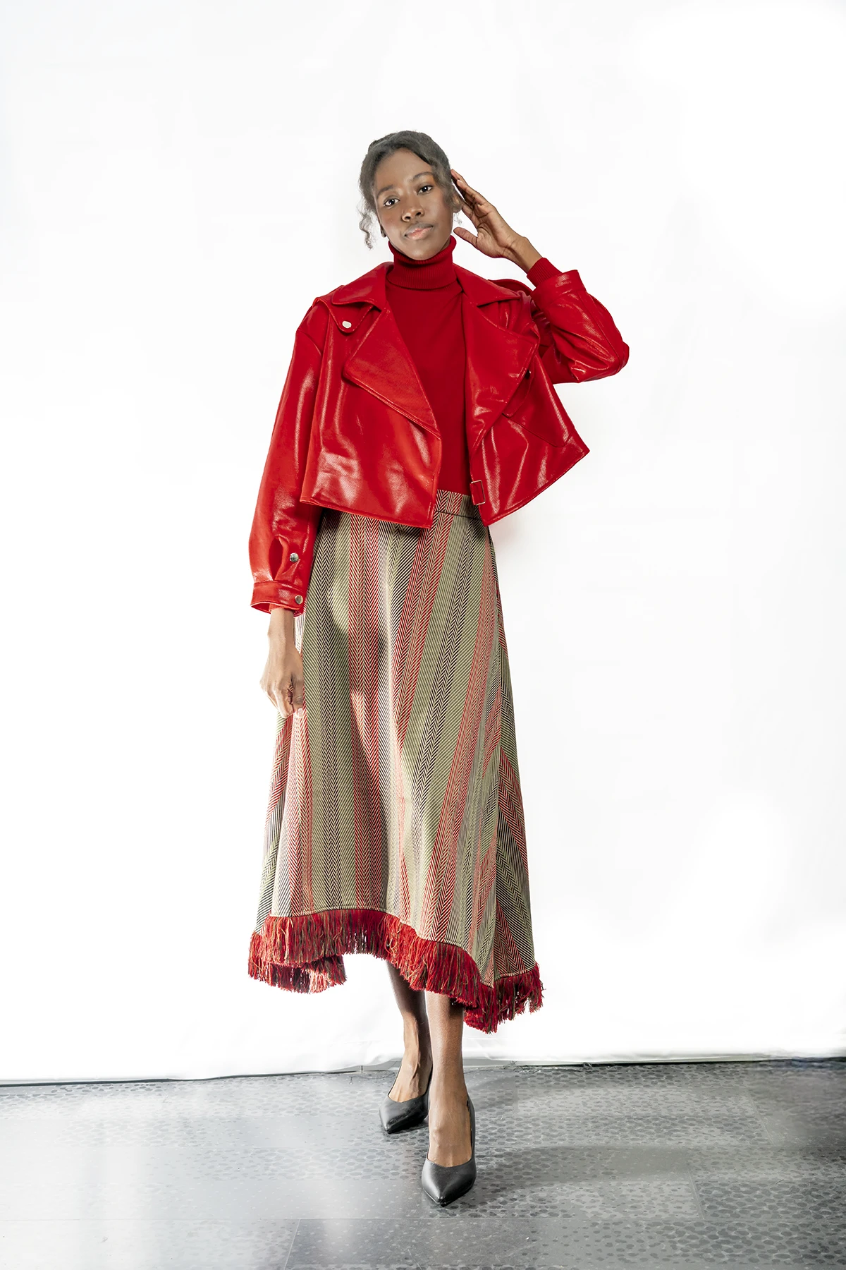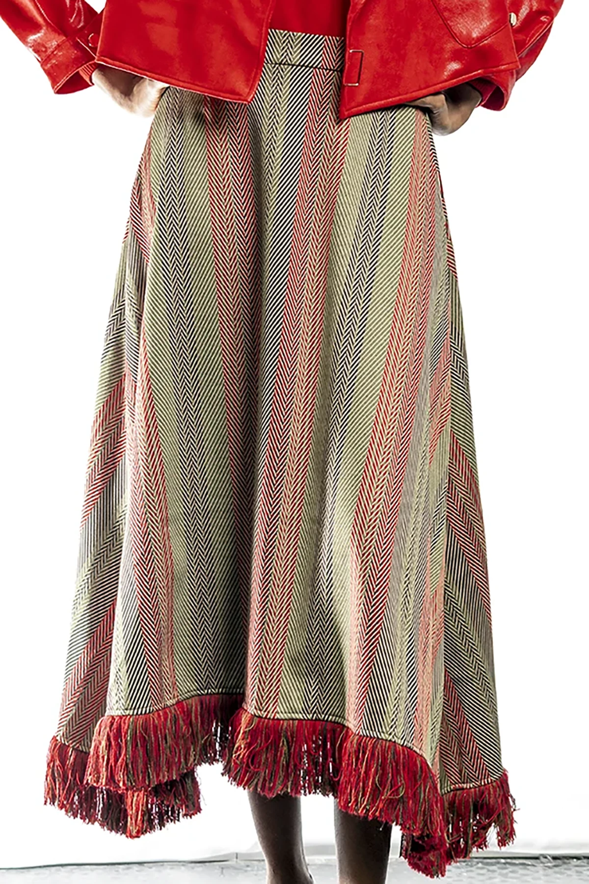 Una falda midi de gran movimiento con estampado de espiga tricolor y bajo de flecos, diseñada para ser la protagonista de cualquier look con su silueta de línea A y textura rica.