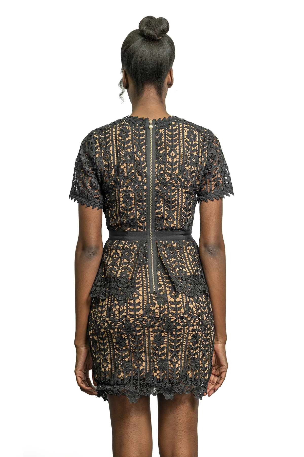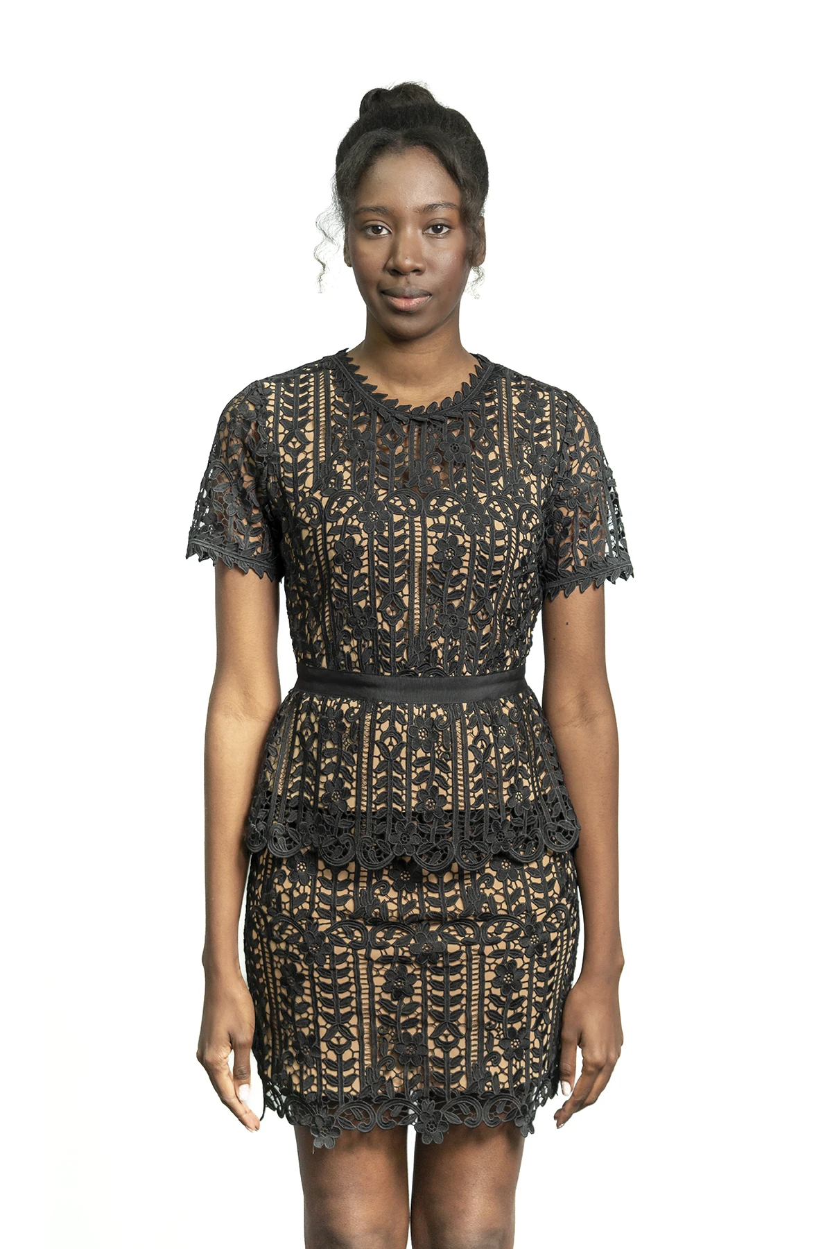 Un sofisticado vestido de cóctel confeccionado en encaje guipur negro sobre una base en tono nude, con detalles peplum y acabados festoneados que definen una silueta impecable.